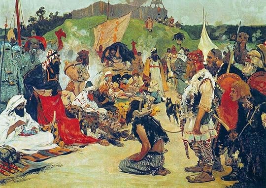 ছবিঃ খাজারদের (তুর্কী বংশোদ্ভূত স্লাভিক মুসলমান) কাছে রাশানরা ক্রীতদাস বিক্রী করছে। সের্গেই ইভানভ (১৯১৩)। সূত্রঃ উইকিপিডিয়া