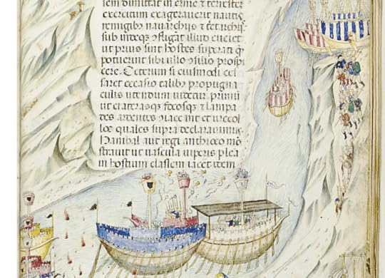 This, like the Hengwrt Chaucer and Carmina Burana, is not a religious text. It is more of a princely affairs' trio of works bound together. Think along the lines of Machiavelli's The Prince. It includes a section on warfare that I found enormously entertaining, because war machines and strategies always fascinate me. The vases filled with venomous vipers as a ship to ship volley is great, see them below.