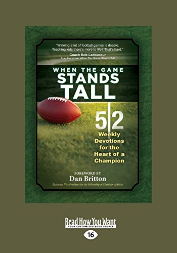This is a companion devotional book to the upcoming feature film When the Game Stands Tall starring Jim Caviezel as Coach Bob Ladouceur, Laura Dern as his wife, and Michael Chiklis as assistant coach Terry Eidson. An adaptation of the bestselling book of the same name, the film chronicles the rise of the football program of De La Salle High School (Concord, CA) and their record - setting 151 - game winning streak in 1992 - 2003. The devotional is designed for Christians and others who see the movie and want to go deeper. The 52 devotionals are based on Scripture and relate to an aspect of the game of football (e.g., Listening to the Call, Knowing the Playbook, Practicing Well, Pushing through Exhaustion, Knowing Your Opponent, Playing Fair, etc.). Each devotional covers three pages and will feature a relevant Bible passage, a devotional based on a football related topic and a page for journaling personal reflections.