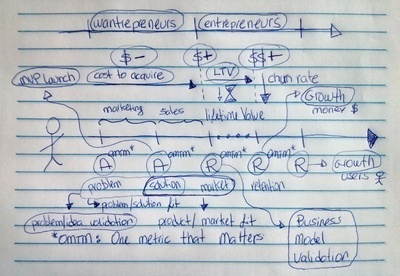 * Day 6: Set targets - One Metric That Matters (OMTM): + should be a financial metric (MRR: monthly recurring revenue, number of paying customers/month...) + who signing up (should be people you don't know). + different metrics for different times. - Assessment tips: + Problem/Idea validation: do people really need this product? + MVP launch: how many people sign up for it? (weekly, monthly) + Business model validation: profit margin (with founders and without founders/hire employees) + Growth: customer CPA(cost per acquisition) and LTV(lifetime value) -> CPA < LTV