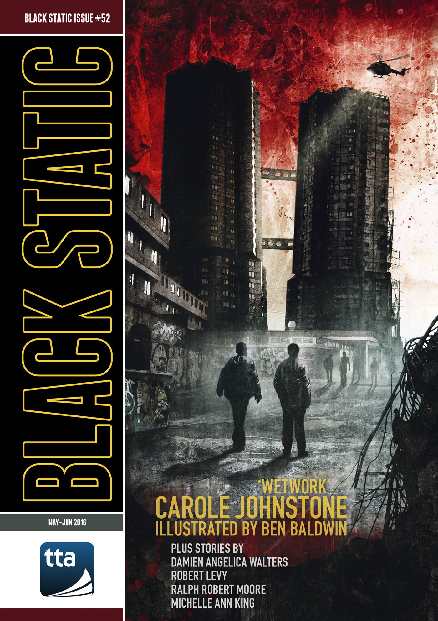 Spring brings the May–June issue, #52, and Carole Johnstone's 17,000-word novelette 'Wetwork', which inspired Ben Baldwin’s cover and interior art. Damien Angelica Walters, Robert Levy, Michelle Ann King, and Ralph Robert Moore supply more stories with interior illustrations by Dave Senecal, Warwick Fraser-Coombe, and Joachim Luetke. Comment- Stephen Volk and Lynda E. Rucker; book reviews- Peter Tennant (Paul Meloy interviewed); Blood Spectrum- Gary Couzens (media reviews)