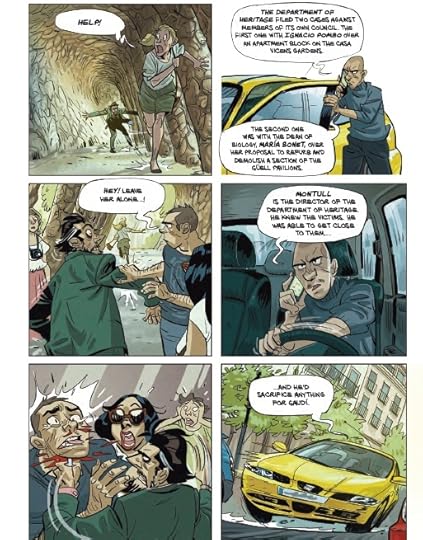 Total que además de la trama, las ilustraciones a todo color son la host... la bomba. O sea realmente me quito el sombrero. El dibujante tiene un autentico talento para plasmar en el cómic los edificios de Gaudí y sus interiores, lo cual no es fácil. No he tenido la oportunidad de visitar todos los monumentos que salen en el cómic pero los he visto en fotografías y están muy logrados tanto en dibujo como en color, parecía como si realmente estuviera allí.
