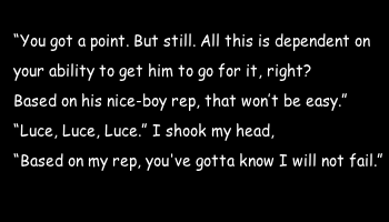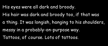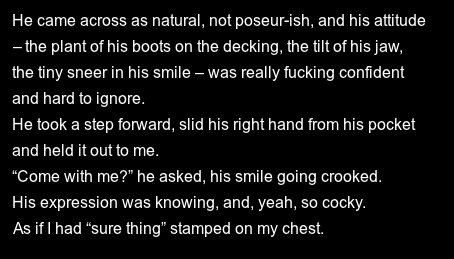 "What are you thinking about? he asked, grinning up at me, his fingers absently stroking the tattoo on my neck. "Love that smile."