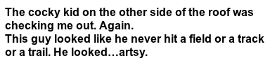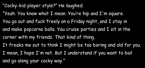 "Yeah." His smile was on the sad side. "Yeah. that's it exactly." He shot me a floppy peace sign-yep, his goodbye sucked as badly as his rejection-and left.