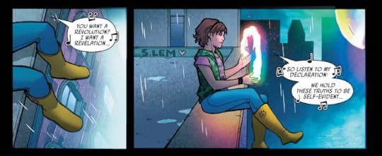 I really like this idea of addressing young girls wanting super powers when they are young but the lack of female heroes for them to look up to and then addressing a situation where a young girl is given powers she doesn't know how to use. This may be the first Marvel comic to ever use the word tampon and it did it twice! (Plus the Hamilton references get it bonus points.)
