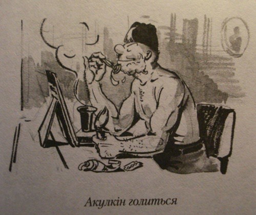 I was absolutely smitten by his Акулкін — his graphic alter-ego, through whom Гога depicted various aspects of his life, mostly funny ones. It’s something like Швейк, only Гога told about himself and the life about him in a comical manner via Акулкін.