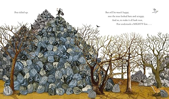 After really enjoying Meerkat Mail, I decided to look at some of Emily Gravett's other work. Contrasting MM, this is a very simple story, most suitable for EYFS (but still wouldn't be out of place in a KS1 book corner). A badger named Pete loves to clean the forest - to the extent that he chops it all down and replaces it with concrete, so it can never get messy ever again. But he realises that he's gone too far - both he and other animals rely on the forest. Together, they re-build it, and from now on Pete decides that only the actual rubbish should be put in the bin.