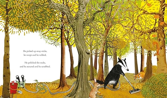 A badger is obsessed with tidying. Removing dead trees and bagging up leaves, eventually he concretes over the whole place in his quest for tidiness. He then doesn't have a home so the animals help him to put it back the way it was.
