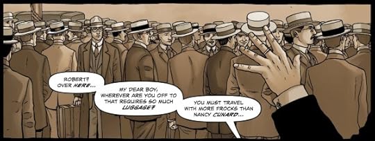 And I.N. (Intrepid Narrator) finally makes it to Providence, there to meet a researcher with peculiar glasses (which can see hidden creatures; this apparently does not agitate them like it did in the Lovecraft story), a young student who shows him around, and, of course, Lovecraft himself. The young student is also named Howard. I wonder if he's a stand-in for Robert Barlowe (as I.N. is named "Robert"). Possible, but unclear as yet. He also happens to look a great deal like his grandfather Joseph Culwen (or Curwen from the stories), so he may not last past the next installment.