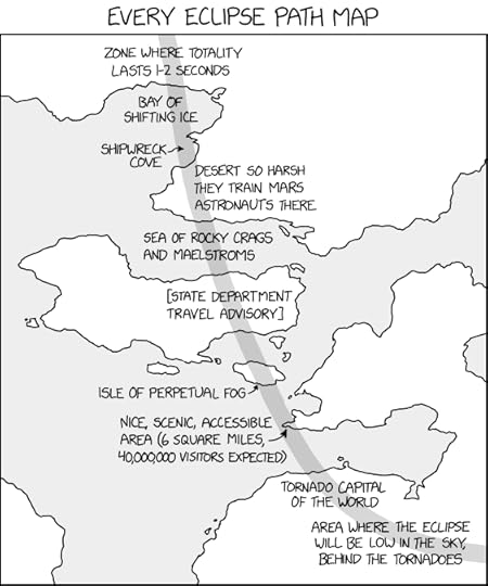 **spoiler alert** Some neat tidbits about eclipses that can be gleaned from this book (there’s also much more!), which I’m collecting here for future reference: * Eclipses have led to more precise calendars (e.g. dating the first Olympics) and maps (e.g. the measurement of longitudes). * Mythical stories about eclipses support a theory of common heritage between people on different continents. * Benjamin Franklin used the fact that a lunar eclipse was obscured in Philadelphia but not Boston combined with wind direction to postulate that hurricanes are counterclockwise rotating vortices. * Helium was first discovered on the Sun (before it was discovered on Earth) in 1868 thanks to observations of the solar atmosphere during a solar eclipse. * In the late 19th century, many scientists chased eclipses in hope of detecting the hypothetical planet Vulcan (which was postulated to explain the precession of the perihelion of Mercury). It turned out this effect was explained by Einstein's modification of gravity rather than a new planet. * The first experimental test of Einstein’s theory of general relativity was made during a solar eclipse in 1919. Gravitational lensing (the bending of light in the presence of a massive object) makes stars appear in a slightly different location when they are close to the Sun, and the observed difference exactly matches the prediction from general relativity. * A German expedition to Crimea in 1914 attempted to make the measurement to test general relativity five years earlier, but failed when WWI broke out and they were captured by Russians. It turned out to be lucky that the measurement wasn’t made in 1914, since at that time there was a mistake (factor of 2) in the calculation that was corrected by 1919. * During a lunar eclipse in 1927, a measurement of the rate of cooling of the lunar surface as it entered the Earth's shadow led to the prediction that most of the Moon was covered by a layer of dust. This was confirmed decades later during the Moon landing. * The moon’s shadow during a solar eclipse travels thousands of miles per hour. * By traveling on a plane moving faster than the speed of sound, it is possible to extend the time of totality from several minutes to over an hour. * You have a 20% chance of seeing a total solar eclipse during your lifetime from a given location, without traveling to find one. * The Earth is the only planet in our solar system from which it is (known to be) possible to see a total solar eclipse. * Eclipses would have looked very different in ancient and medieval times (say, before 1400) since there would have been little visible corona (the bright layer surrounding the Sun) due to decreased solar activity. In the near future the corona will also become much less visible. * In around 600 million years there will be no more total solar eclipses since the Moon will have moved too far away from the Earth; its shadow will be too small to fully cover the Sun.