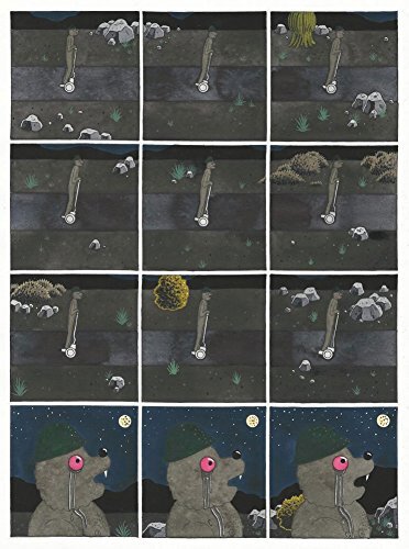 P 159. Werewolf Jones stabs his eyeball with a hypodermic needle. Well, that’s different alrighty! I applaud, sort of, the author’s bravery here. Still, call me old fashioned, but something about it didn’t sit especially well with me. Good thing the two page story that follows, Ignore all Messages, was for me the most interesting one in the entire book. It’s wordless. WJ on a Segway, scootering over a desert-like landscape, the beautifully painted sky going from dusk to dark, cacti oddly resembling sea anemones, Stonehenge-like rocks in the distance. The last few panels pulling in, we see WJ’s wounded eye pondering the distant moon.