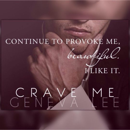 Crave Me is extremely sensual, it’s highly erotic, and more than a titch kinky. It is also superbly written with a full range of characters that you can’t help being drawn to. Whether you love them or despise them will remain to be seen, but their story will draw you in and it’ll hook you from the very beginning. I found myself in total rapture by Belle and Smith’s story as it began, continued and evolved. I couldn’t put the dang book down! Geneva Lee creates an atmosphere of total of undeniable, unrestrained passion, while weaving in the thrills, secrets, and deception. Watching two characters literally locked in a battle of wills, trying to deny their inevitable chemistry does indeed amuse, but when the flame refuses to extinguished that’s when it gets real. White hot passion, an unexplored and unknown desire to be tamed, the absolute need to possess and dominate, and tortured pasts are all about to converge in one truly hypnotizing read. Some of the scenes made me blush, a lot of them made me very warm and more than a few made me glance over my shoulder! Crave Me captivated me, from start to finish. It also ended in a bit of a cliff hanger, it was just enough to illicit a full blown temper tantrum from me when I finished! I needed more pages! I need to know what will happen next, I need answers! Now I’m left with a spinning top for a mind as I sit here trying to imagine what will happen next! It’s kind of cruel for Geneva to once again leave me hanging, she’s done it before and now she’s done it again! I never seem to learn my lesson…