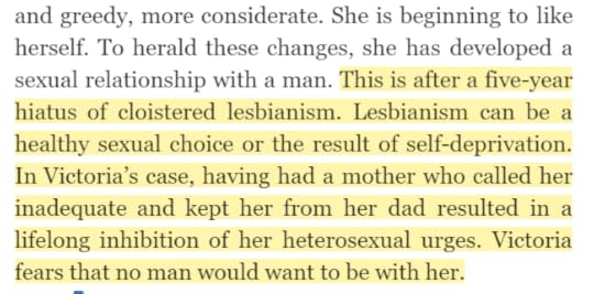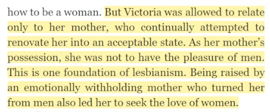 And then there were troubling statements like these that turn sexuality into a direct result of abuse, likening it to a mental health disorder. Folks, this is a big NOPE. When I read the section on Victoria, I couldn't help but think that she was simply a lesbian, and that was the cause of the tension between her and her parents.