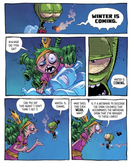 So this issue is basically a false start to the second arc as Young tries different things to make the Queen Gertie storyline work before abandoning it entirely by the end. It’s not a terrible read just an unfocused one. Young pokes fun at fantasy staples Harry Potter and Game of Thrones (“Winter Is Coming… Harriet Winter. From HR. To fire you.”) and it’s amusing seeing Gertie inadvertently becoming the evil queen through sheer incompetence at the job. And the best part is still an entire issue of Young’s wonderful artwork and Jean-Francois Beaulieu’s beautiful colours.