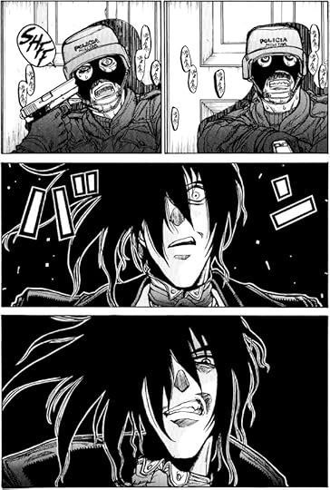 Wow, now that was a hell of an adventure! I was 100% sure I wouldn't give another 5 stars to any other "Hellsing" volume, and yet, here I am - doing it! So.. Why I thought I wouldn't? I kind of grew tired of all the teared and flying around human limbs. Also, Alucard has a dying wish or something since he gets killed in almost (or) every battle he has engaged so far. The cop has a little appearance at all, and I wanted to see more of her to begin with. BUT! It is good. Really good. The art is improving: Kohta-sensei is no longer in huge pointy noses, now they are normally long and pointy. Alucard is getting more and more insane with every new page, I think I'm starting to fall for him even if Kohta-sensei rarely troubles to draw his entire face. The story is revealing really fast, I mean, what happened at vol.2 was the end of 13-episodes of anime! So imagine my surprise when what I knew would happen and expected it to happen around the 7th volume, happened so early! Another 7 volumes of pure, evil unknown, now that's a great start! I got so into this manga, that I'd stop on some beautiful (in a sick, twisted way, ya know) panel and just admire it for several more seconds before I proceed to the next one. To feel it. To remember it. To admire it.