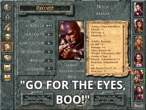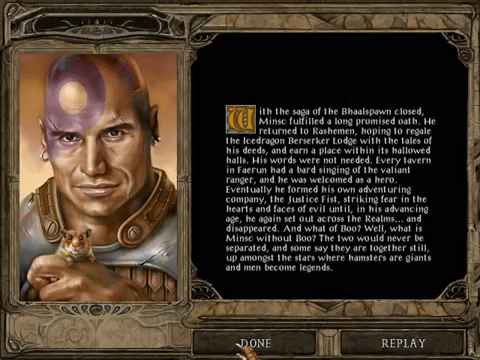 It was just great finding here Minsc, the deranged barbarian ranger from the awesome 1998 Baldur's Gate videogame series, and his "space hamster" Boo, a low resolution pixeled fantasy duo that left an indelible mark on PC and D&D gamers everywhere in the world.