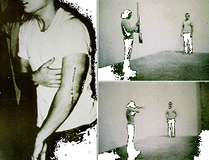 In 1971 (the early 70s were very big years for performance art & this book is dated 1979) he performed "Shooting Piece" in which he had a friend shoot him in the arm as an "enquiry into what it feels to be shot. Two or three thousand people get shot every night on tv and it has always been something to be avoided. So i took the flipside and asked what if you faced this head on." Or arm on, as it happened.