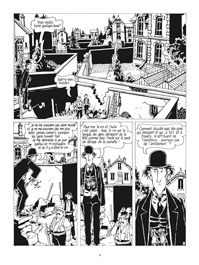 Tardi's bold black-and-white art matches the story's tone. His figures are cartoonish, their expressions exaggerated, and their outfits have a humorously quaint, old-timey feel. He also, on occasion, lets the characters' internal worlds seep out onto the page, drawing their surreal daydreams as if they're real, or metaphorically representing their fears. His ink work is invariably gorgeous, particularly his treatment of architecture. Above all, it looks fantastic when he makes it rain, with raindrops white over black inks and black over white backgrounds.