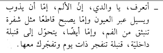 "ركضت نحو المنزل فوق غيمة من اللهب والدخان. على الطريق، رأيت والدة ياسين. كانت تركض عارية بالكامل... لم تكن تصرخ، بل تضحك وكأنها مجنونة تركض في جميع الاتجاهات. كانت في الحمام حين سقطت القذيفة... انفجر الحمام... ماتت بعض النساء، ودفن البعض الآخر وهنّ أحياء... لكن كنتي... لو فقدت عيني لحظتها كي لا أراها في عراها هذا. أردت التقاطها لكنها اختفت في اللهب. لا أعرف كيف وجدت المنزل لم يبق منه شيء لقد تحول إلى قبر لزوجتي، لابني الآخر، لزوجته وأطفاله. حلقك على شفير الانفجار. تسيل دمعة. تذهب لاستقبالها على عينيك بذيل عمامتك. من ثم تتابع! لم يبق سوى هذا الحفيد على قيد الحياة، ولا يستطيع أن يسمعني. اشعر كأنني أكلم حجراً. يحطم ذلك قلبي... لا يكفي الكلام يا أخي، إذا لم يسمعك أحد، إنه لا يفيد بشيء، مثل الدموع..".
