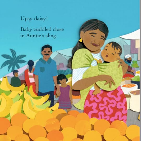 diverse picture book (world cultures, new baby for older siblings?; for preschoolers 3 and up) * prominently features diverse characters: families from around the world, babies being carried by various family members from what can be interpreted as single-mother households, grandma- or grandpa-as-caretaker households (grandpa is wearing a turban and the little girl sibling is wearing a headscarf), single dad (in a wheelchair) households, adoptive auntie/uncle households--or they can be interpreted in the nuclear family way. The final spread shows a biracial family. * woulld work for preschool storytime -- the text is too long for toddlers, but this might work for a "new baby coming" theme to prep kids for a younger sibling, or it could work well as a one-on-one readaloud. All of the caretakers say "upsy daisy" when they lift their little ones up, which seems both quaintly cute but also overly generic. I guess I'm ok with it, though doing different voices can be tricky because accents are hard to do correctly and probably best avoided... something to consider.