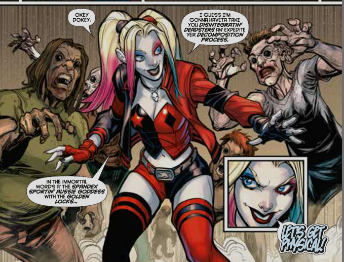 Story: If you are easily offended you should not be reading this series. If you are looking for a grand arc and great character development you should not read this series. If you just want a crazy gal running around with her gang doing crazy stuff and cracking a joke every page and offending everyone and making you feel slightly uncomfortable you will enjoy this book. This is a Harley that's not the classic animated series harley. Since the New52 the series has been like this and if you like it you'll get more of the same after Rebirth. If you don't this new series will not change that. The two main arcs the time were okay, they had all the fun I expected and also the ridiculous that makes me read this book between heavy books for a palate cleanse. The zombie book was fun but expected and the punk rock one was genre but also expected. It's fun.