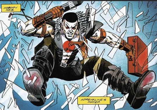 I’d never read anything from Valiant before, so I was mildly shocked to realize they didn’t follow the Comics Code at a time when DC & Marvel still did. Bloodshot is, well, bloodier than other superhero stuff, and if nothing else it stands out because of that. It’s still pretty standard gritty 90’s stuff, though. Tough guy narration, amnesia, lots of pouches on costumes, women are basically nonexistent, and so on.
