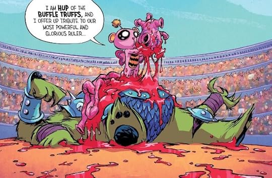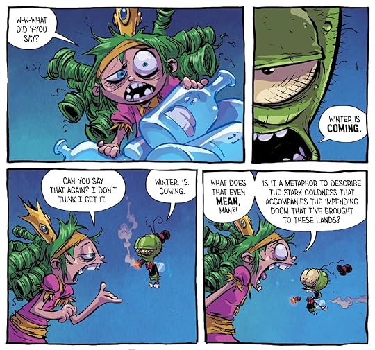 Being queen unfortunately is no fun so Gertrude is still looking for a way home. Basically, these issues are a string of further quests. Sadly, not one of the quests was very original, I really missed the wit too, and the introduction of another kid from our world and TIME-TRAVEL of all things ruined it for me. Maybe Skottie Young and the others tried making fun of all the wizarding and time-travel stuff in other comics, but the way they did it just didn't make me laugh! :(