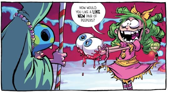 At the conclusion of the previous book, Gert has been crowned the Queen of Fairyland, and as you can expect her tenure as queen does not go well. She is unsuited for queenly duties, and as such her kingdom falls into chaos, albeit in a funny candy-coated gory way. But author Skottie Young never intends for Gert to remain static, so she manages to get terminated from her job so she can move on to her next adventure.