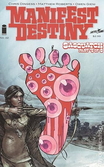 Retomo esta serie de Image que había dejado colgada desde los primeros meses del 2017 (me leí todo lo que había de un tirón hasta ese momento y luego hube de esperar, que se le va a hacer). Para aquellos que no recuerden de qué estamos hablando, Manifest Destiny reinventa el viaje que hicieran los exploradores Lewis y Clark allá por inicios del siglo XIX en una cacería interminable de monstruos, un survival de horror que no desdeña tampoco la mejor aventura (y tiene, en su desarrollo de personajes, una buena cuota de existencialismo). Este tomo, el cuarto de la serie, no se aleja demasiado de los lineamientos que la serie ya ha hecho su estilo en los guiones de Dingess: nuestros protagonistas viajan a otro punto, se encuentran con otro tipo de ser, muere alguno de su elenco convenientemente interminable, logran eliminar al enemigo y siguen adelante. Pero esta vez el argumento -que ya podría empezar a resultar cansino- se ve innovado con flashbacks a la expedición anterior, a los predecesores de Lewis y Clark (que apenas habían sido sugeridos hasta el momento) y con esta historia se da un marco, un contexto, que la trama no había tenido hasta entonces. Sin embargo, no es Sasquatch el mejor tomo de la serie. Hay poco de interés en este nuevo monstruo, como nos dedicamos al flashback no aportamos nada nuevo en nuestros protagonistas "presentes" y termina en definitiva siendo otro encuentro más -muy entretenido, sí, y de nuevo estupendamente dibujado por Roberts y coloreado por Gieni- que no especialmente relevante en el contexto mayor. Hay puntas de interés en lo que pasó con la expedición anterior -cuyo mayor avance como expedición fue, justamente, hasta aquí- que sirve de ominosa prolepsis para nuestros protagonistas. Obviamente, veremos como sigue la cosa.