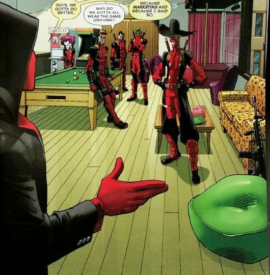 Deadpool is back but things have changed. He's now part of the Uncanny Avengers and is a popular hero, rather than simply a mercenary like he was before. He's also hired a bunch of mercenaries to dress as him to do extra Deadpool-ing.