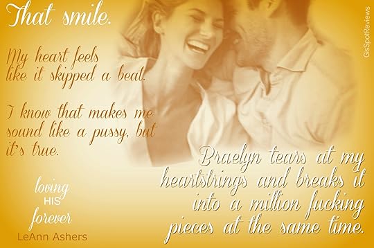 So I read a ton of books. I love an alpha male as much as the next girl. What I love about Ms. Asher's heroes is they are alpha to the core but they RESPECT their women with everything in them. They are protective without being suffocating. They are absolute dirty talkers which I love. Once they meet the woman for them, they never stray. They don't even notice other women around them. They are not manwhores and constantly thinking about their past with OW. Honestly, I don't even know Ethan's past as far as that goes and I don't need to. The love he has for Braelyn is so obvious on every page of this book. So kudos to this author for writing these unbelievable men.