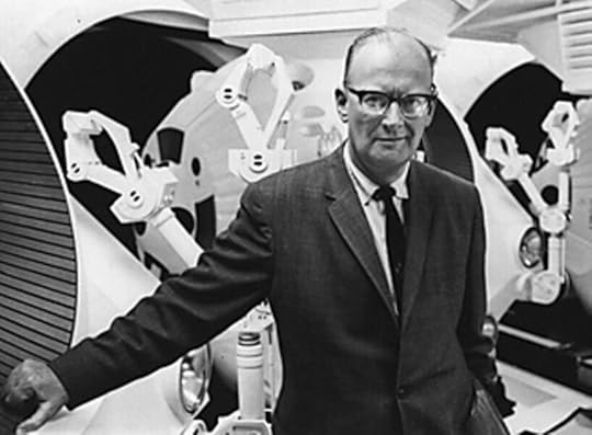 [Arthur C. Clarke on the set of the film 2001: A Space Odyssey, circa 1967. Clarke and filmmaker Stanley Kubrick used Clarke’s short story “The Sentinel” (1948, first published in 1951) as a starting point for the 2001 project. Clarke states that his short story "Encounter in the Dawn" (1953) inspired the film, too. Clarke wrote the novel 2001: A Space Odyssey concurrently with the writing and production of the film]