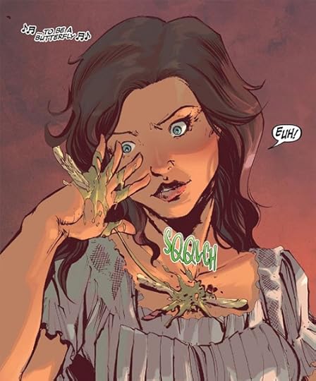 I liked the artistic efforts to convey the otherness of the characters and conflict: odd-shaped panels, slanted double page spreads, full-page art that revels in the coolness of this or that monster. And panel by panel, the art is very cool. Great colors. But this is some of the worst artistic storytelling I've seen. When did Lady Bertram get tied up with magic vines?? Where did the giant talking eagle come from?? If they don't know how they became were-butterflies, why aren't Mariah and Lady Bertram freaking out? I kept flipping back to try to figure things out, and what's worse, flipping back usually didn't clear things up.