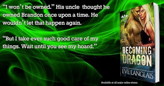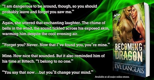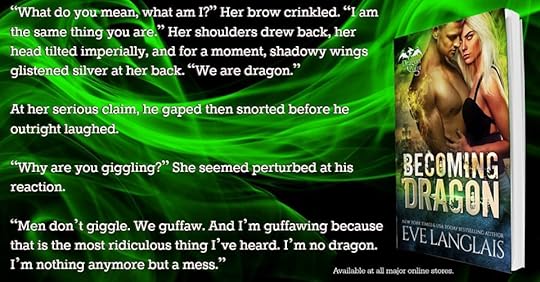 BECOMING DRAGON is the first installment in Eve Langlais' new series, DRAGON POINT. It was fascinating, humorous, emotional and exhilarating. I recommend you guys give this book a chance. Two thumbs up!