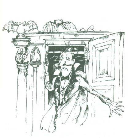 "Llevaba el negro pelo peinado hacia atrás y tenia los ojos bordeados de rojo. Vestía traje negro, camisa almidonada y lazo negro al cuello. Un medallón de oro colgaba de una cadena sobre su pecho, y se cubría los hombros y la espalda con una capa negra con vueltas escarlata."