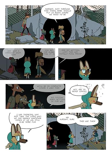 Simon, a dog, Cliff, a raccoon, and Reynard, a deer are three friends inhabiting a dystopian landscape, possibly devoid of humans, too early to say, but definitely the town they are in is abandoned. They spend almost the whole time scavenging for food and water. Not much left, they go to bed hungry many days. They meet Barnaby, a dog who tells them of another town, that isn't abandoned. The story tells of their journey to find this town. Not much happens, but 1) there is a kind of growing dread about the catastrophe and 2) we admire their will to survive as friends (though there are frustrations, conflicts).