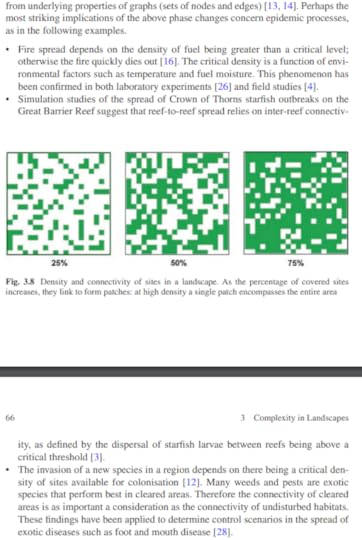 This was an interesting book that provides a basic discussion of how tools of complexity theory such as fractals, cellular automata and network theory can be used to simulate, analyze and study ecological systems. The discussion does not seem dumbed down, but it is still very accessible and does not require any background in complexity theory to understand. The book shows how systems built on simple rules can show incredibly complex behaviors that mirror natural phenomena. I was intrigued by the discussion of how the same simple cellular automata can be used to model wildfires, epidemics and a variety of other spreading phenomena and how the "patchiness" of the "fuel supply" is the primary determinant of whether the fire/epidemic spreads. Also interesting was the discussion of how the connectedness of a network spreads rapidly when connections reach a critical point and how the increase in connections increases the probability that positive feedback loops will develop that can cause the system to crash and burn. Over the week that I have been reading this book, I have found myself looking for things in my daily life that could be modeled as networks or as cellular automata, so it has definitely had an impact on my thinking. The second half of the book strays away from the main theme of using complexity theory in ecology and gets into a more general discussion of the role of technology in ecology and current problems of global ecology such as climate change. I found this part of the book to be a bit less interesting and rewarding, but still easy to read and containing some interesting information.