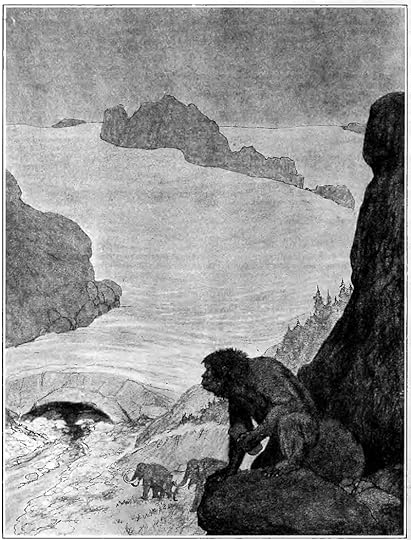 Illustration from the Saturday Evening Post, Jan 21, 1911, for the article The Grisly Folk and Their War With Men Author H. G. Wells and Illustrator Charles Livingston Bull. He lived in a Bleak Land on the Edge of the Snows and Glaciers That Were Even Then Receding Northward
