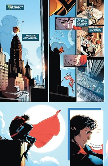 I love how Superman #7 is self-aware of Batman's absurdity. Here, we see Supes' "optimistic brooding" over the city of Metropolis.