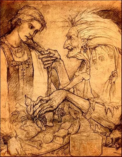 The witch simply loses her temper, and tells Lily she is “not ready for Baba’s game.” However, Baba Yaga is intrigued by the “wild magic” in Lily, and thinks: “Such a girl could be very useful. Or dangerous. Possibly both.” The witch decides to follow Lily in her journey beyond the safety of childhood into the dangerous world. Although she is a cannibal who eats children, the witch becomes a kind of supernatural godmother to Lily, an older woman who is better for her than Lily’s own mother.