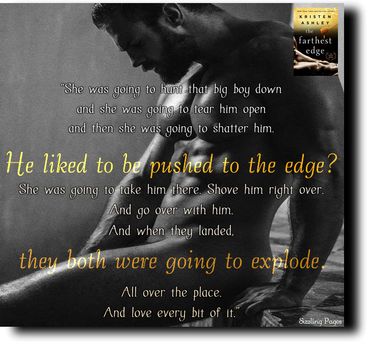 Who knew it felt that good to take the plunge, land and shatter?"The Farthest Edge" is one of those books that rubber stamps itself in your memory, not just for the kinkiness and heat (although that really was a huge bonus), but for the unconventional yet fantastic story that wove itself through the pages. This was so classic Kristen Ashley yet so unique in so many ways, wouldn't you agree Derna?