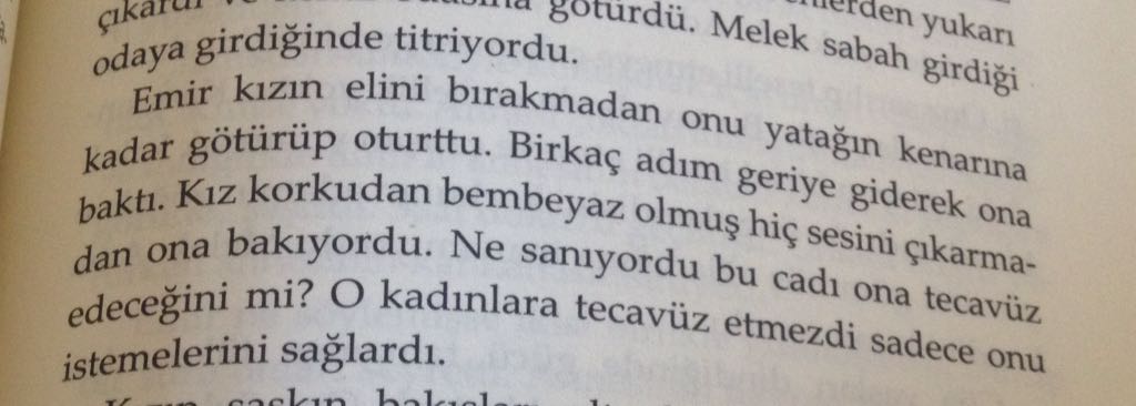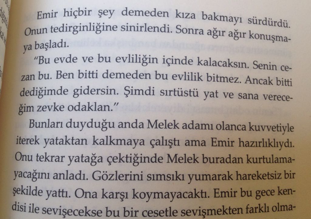 Ama bazı sahneler vardı... çıldırdım. Gerçekten bir eziyetti o sahneleri okumak. İçimdeki küçük feminist kitabın içine girip Emir'i evire çevire dövmek istedi. Bir de bu adamın teknik olarak eğitimli, bilgili biri olması gerekiyor. (Sanırım eğitim bazen gerçekten hiçbir işe yaramıyor ya da o kısmı ben yanlış anladım.)