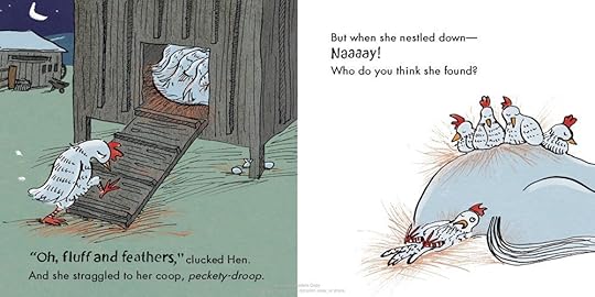 A fun take on a familiar theme of someone is in your place. This time the farm animals find their friends sleeping in their places. Who will be the last animal evicted from their bed and where will they be invited to sleep. Love the various phrases used by the animals when the are evicted, the cow says, "Oh, hayseeds" and the hen clucks, "Oh, fluff and feathers." This a definite for a storytime.
