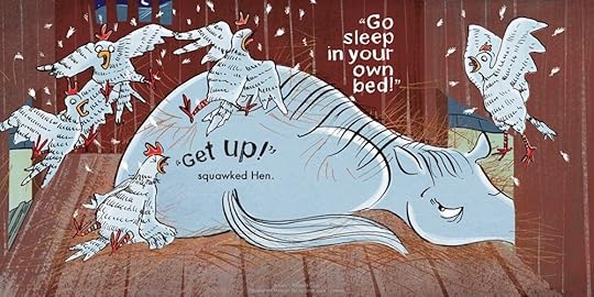 When Pig plops into his sty at bedtime, he finds Cow fast asleep in his spot. “Go sleep in your own bed!” he squeals, and sends her packing. But when Cow finally snuggles down into her stall, she finds Hen sleeping there. So begins a chain reaction of snoozing barnyard animals being awakened and sent off to their own beds, until every last one is in just the right place.