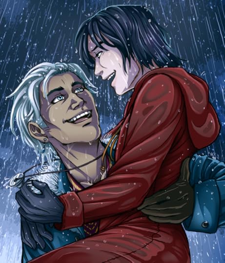 Scarlet threw Liall off, wiping his mouth on his sleeve, and stood several paces away, his chest heaving and his eyes spitting hate. The silly cap had fallen off and revealed his midnight hair underneath, though his bangs and the fringe of disheveled hair around his face were grimed with the flour he had combed into it. With his legs tangling in the wide skirt and his padded bosom jiggling, he looked ludicrous, which only made the men laugh harder.