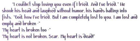 “My heart is not broken, Scar. My heart is dead!” His eyes were hopeless and wild. “It is a hollow black object that sits in my chest without purpose, haunting me with memories.”