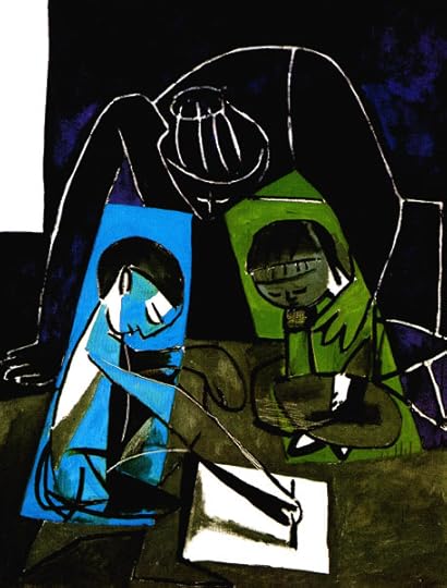 “Picasso was now scarcely concerned to mirror the outside world. Instead, he took his own work as the center of the creative universe.” ---------- With Claude Drawing, Françoise et Paloma, the exclusive focus of attention for all three - woman, little girl and little boy - is the little boy’s process of drawing on paper. Such a tender rendering, the arm around the little girl, each child given its own rectangle of vivid color, the adult’s supportive presence and eyeing of the paper. And, along with his drawing, Claude has such a calm, inward focus, as if his sketch is an extension of his confidence and tenderness. My sense is Claude can represent Picasso returning to his own youthful vision of what it means to be a creative artist.