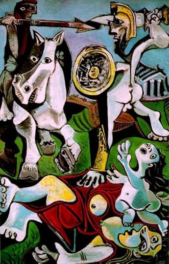 “Picasso’s work from the later 1950s onwards typically drew upon personal material and also worked with constant repetition of his own motifs and compositions.” ---------- The Rape of the Sabine Women is a good case in point. Anybody familiar with Picasso will identify many familiar aspects in this work: the instantly recognizable rendering of the horse, the uplifted, screaming head, the twisted, multi-dimensional head and body of the prone woman. I personally have had several opportunities to view this masterpiece in the Boston Museum of Fine Arts. As with the other pics I’ve included here, a tiny reproduction doesn’t do justice to the actual canvas (195 x 130 cm or about 6 feet high and 4 feet wide). A direct encounter with this Picasso is both astounding and humbling.