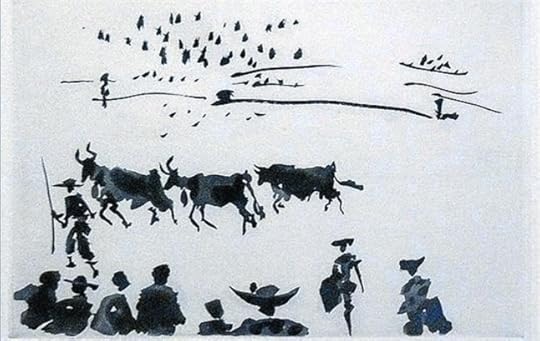 “In old age, Picasso transferred to his art the task of expressing the vitality which was ebbing from his life. Hence, for instance, the new graphic works which, when successful, articulated lifelong fascinations in a succinct and impeccably judged manner. All of the etchings are precise records of carefully-observed scenes, using just a few dabs and strokes, quickly but perfectly done.” ---------- For me, such sparse dabbing and stroking brings to mind Chinese brush painting. What is left unpainted speaks with such subtle power.