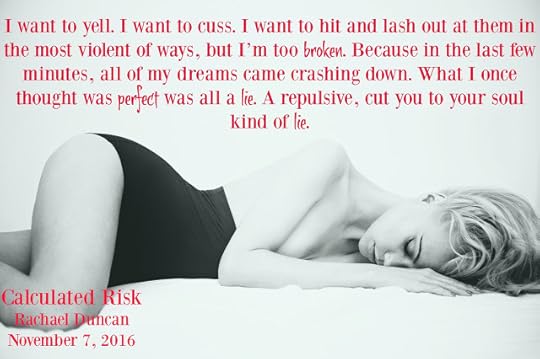 Calculated Risk by Rachel Duncan is the first book in the series and I CANNOT wait for more from this group of friends! This was a perfect read for me with a little bit of love, angst, heartbreak and suspense and I give it 4 stars and recommend it to others! I need Charlottes book like yesterday!!!